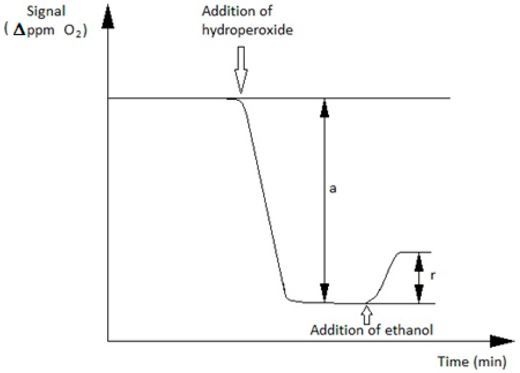 The extent of this oxygen “restoration” is measured by the Clark oxygen electrode, and can be linked to the concentration of the ethanol contained in the decane solution. This allows a suitable calibration straight line to be obtained, by plotting the “r/a” ratio (see Figure 2) vs. the increasing final total concentrations of the added ethanol in the reaction cell solution. The construction of a typical calibration curve, recorded under these conditions, was described in detail in a previous paper [33].