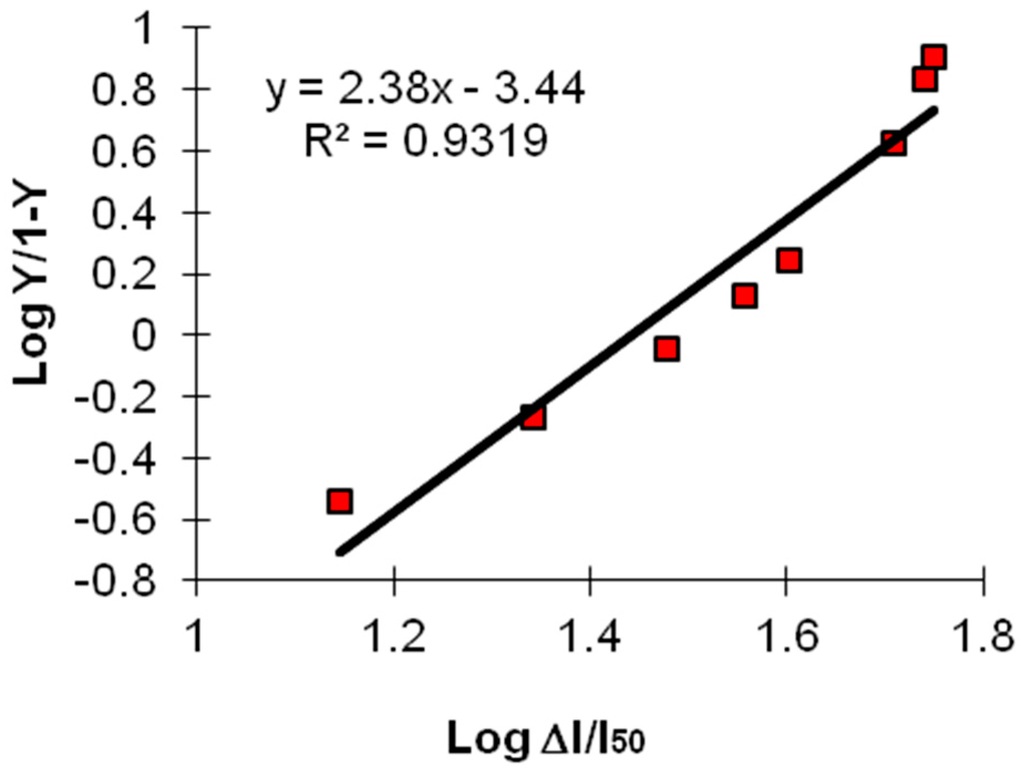 On the other hand, it is well known that the sensitivity of an enzymatic reaction, working in organic media, depends on the deviation from Michaelis–Menten kinetic of the response of the enzyme (catalase in our case) to the substrate molecule (i.e., ethanol herein). It can be determined from the “Hill coefficient”, “x” of the following equation [43,44,45]: