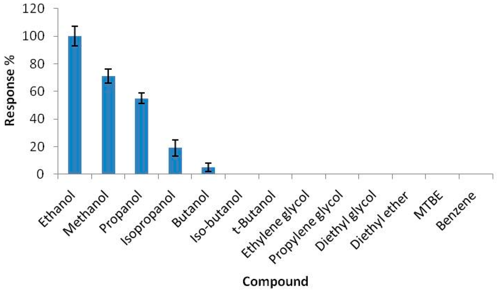 It is noted the response of the biosensor decreases rapidly with increasing chain length and the complexity of the alcohol molecule. The biosensor also responds to methanol (an alcoholic molecule smaller than that of ethanol), but its response in this case is lower (about 30%) compared to that of ethanol. Taking equal to 100% the response to ethanol.