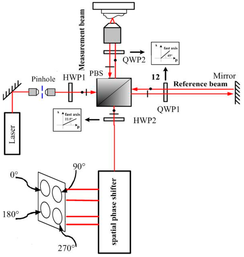 The polarized direction of the reference beam is rotated to be 45° with respect to the horizontal axis but perpendicular to the test beam before entering the spatial phase shifter by the λ/2 phase plate. Then, two beams are divided into two paths by the PBS. The PBS in the lower path produces two interference patterns with the phase shifts 0° and 180° between the reference and test beams. In the upper path, only the test beam is phase shifted by 90° using a QWP before interference. So, the two interference patterns resulting from the upper polarization beam splitter consequently yield phase shifts of 90° and 270°, respectively [16]. The four interference signals have phase shifts of 90° between each other simultaneously without time delay, and are concurrently captured with four detectors. Then, the four interference signals are processed by the four-bucket algorithm.