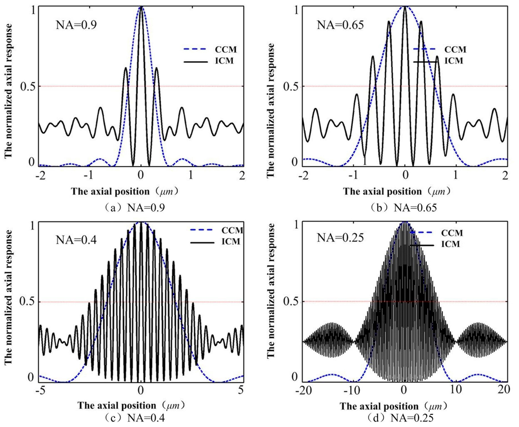The axial depth resolution of conventional confocal microscopy (CCM) mainly depends on the NA of the objective lens, whose full width at half-maximum of the axial intensity response (FWHM) decreases with increasing numerical aperture of the objective lens. However, the FWHM of the ICM stays almost unchanged with the changing of the objective lenses (as shown in Figure 4), implying that we may obtain high resolution with low NA objective lenses, which can obtain large range and long working distance, in the ICM.
