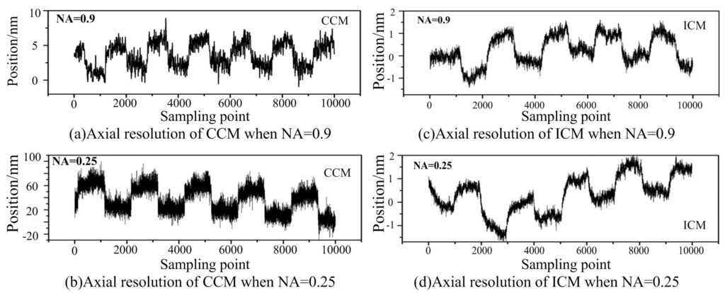 To evaluate the axial resolution of the ICM, experiments are implemented with a 3D object translation stage, P-517.3CD (PI, with closed loop resolution 0.5 nm in the z axis and 1 nm in the x–y axis). The scanned object was a perfect reflector mirror mounted on the object stage. A series of reciprocating motions was generated axially by the stage in a typical workshop environment equipped with no excessive ground isolation for anti-vibration, which can be used to verify the validity of disturbance inhibition of the proposed ICM. Figure 5 shows the comparison of the axial resolution between the ICM and CCM with different objective lenses.