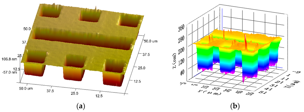 The comparison experiments of height measurements are implemented between atomic force microscopy (AFM) and the proposed ICM, as shown in Figure 6. The profiles of the grooves obtained with AFM (Bruker Dimension ICON and Nanoscope V8.10) and the proposed ICM are given in Figure 7 as a comparison. The glitches of the 3D map in Figure 7 may be caused by accidental error and system noise.