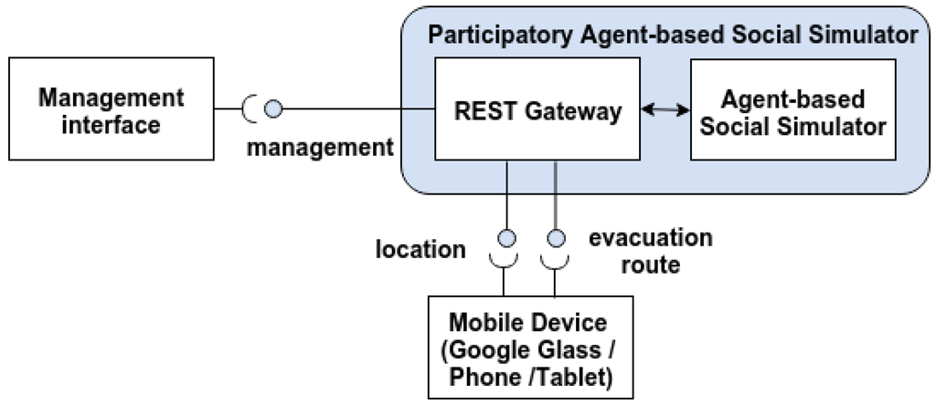 We propose to follow a RESTful architecture for participatory agent-based simulators (Figure 1), which can be used both in shared virtual spaces and real scenarios. The architecture consists of three modules: the participatory agent simulator, mobile devices and a management interface.