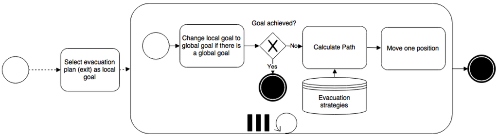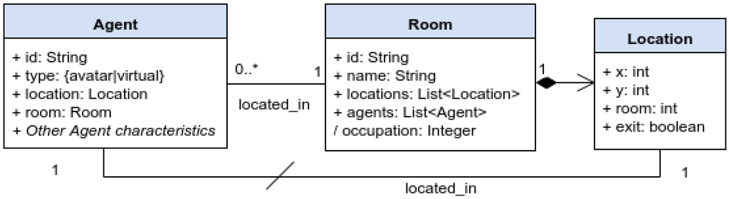 As full-scale evacuation demonstration is not viable because of ethical, practical and financial issues [8], models and simulations of crowd behavior in simulations are widely used to analyze the effectiveness of evacuation preparation activities. Different computer-based simulation approaches are used in the literature for evacuation, such as flow dynamics [9] or cellular automata [10,11]. However, agent-based simulation (ABS) has been used as the preferred method to simulate crowd behavior [12], because agents are particularly suitable for modeling human behavior [13], as its characteristics can be objectively mapped to agent behavior. In order to evaluate how users’ communication is improved, we use participatory agent-based simulations [14], which are agent-based simulations where some users are included as human-controlled avatars. Given that integration of agent-based social simulators with external applications has received little attention by the research community, we propose a general framework for this purpose that is used in the design of the overall solution.
