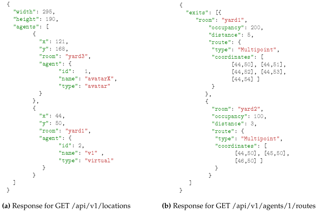 The design of RESTful services accessed by mobile devices depends on the problem we are addressing. In our evacuation scenario, we will follow RESTful design best practices [50,51] for defining them. First, resources are identified, as shown in Figure 2. In our scenario, agents (virtual or avatars) are located in rooms. The space is represented as a grid, with a discrete number of locations. Therefore, each room contains several locations, and walls are considered as non-accessible for users and/or agents. Moreover, some of those locations are exits of the room (i.e., doors). Then, resources are named with URIs and mapped to endpoints, as illustrated in Table 1, where API versioning has been followed and resources have been linked to improve its usability. Finally, resources have been represented with JSON as shown in Figure 3, following GeoJSON conventions for the routes.