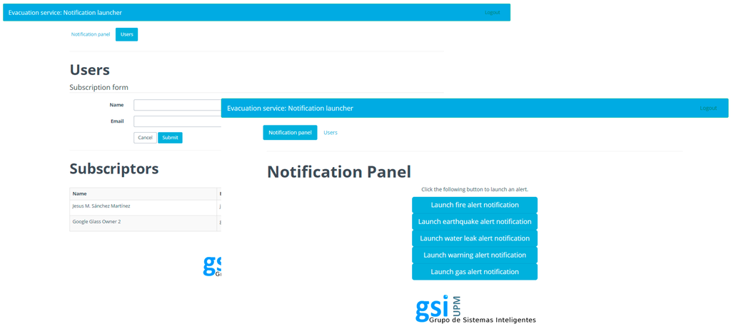 User management and authorization: Google Glass technology requires users to authorize external services to send them notifications using OAuth 2.0 credentials (IETF RFC6749, Microsoft, https://tools.ietf.org/html/rfc6749). The administration interface provides a facility to register users and request their authorization, so that they can be notified in case of emergency. The Google Glass Evacuation application uses the Google Mirror API [15] to be able to receive notifications. This API works as an intermediary between our server and the Google Glass. When users load the application for the first time, they are asked to grant permission for the application to access their Google account that has been linked with the Google Glass device. Once users have granted the application, they can receive notifications from the administrator in their timeline.