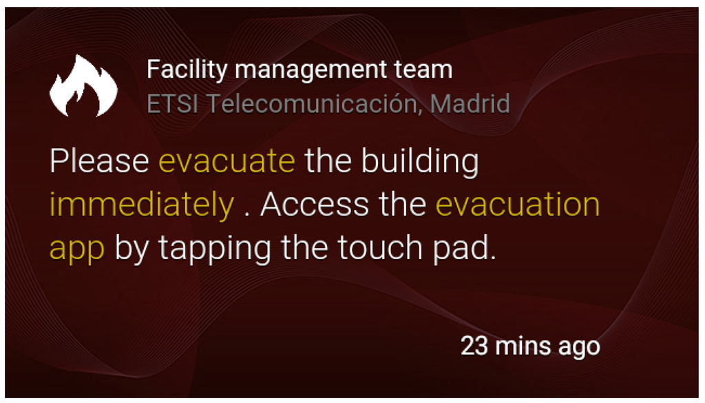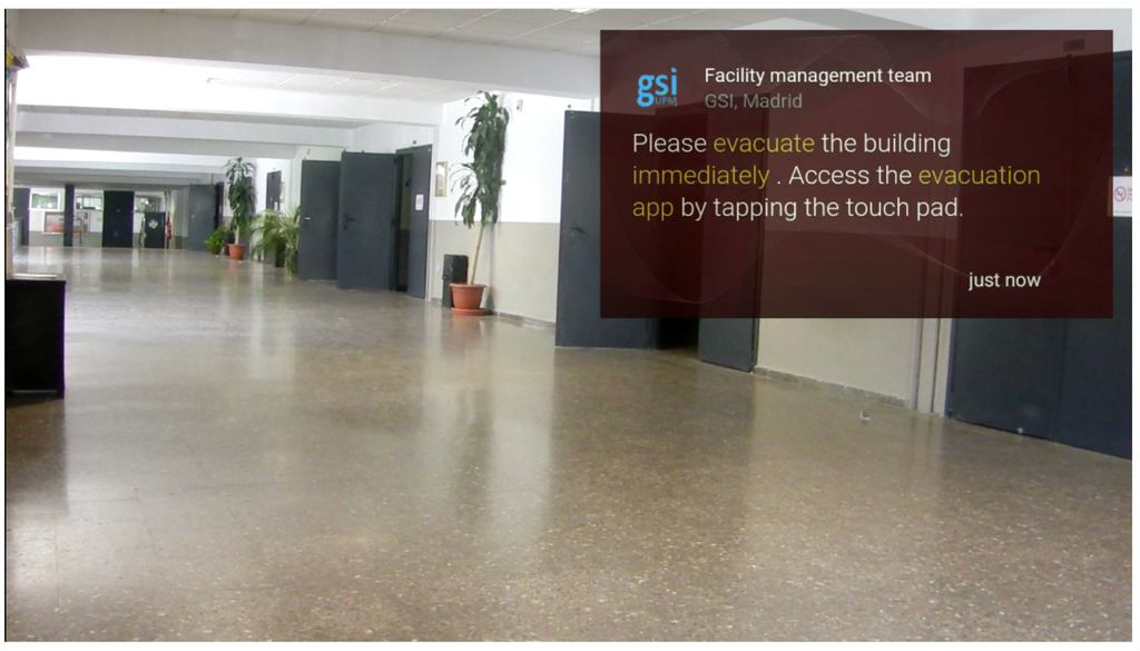 With the aim of understanding crowd behavior in emergencies, mass psychology has developed a number of theories, summarized in Section 2. Some of its findings are that real-time information and communication are critical aspects in preventing crowd disasters [2]. Public address systems and video screens are usually used for communicating with the crowd about the emergency and for providing evacuation instructions. Nevertheless, these systems are not capable of providing individualized evacuation instructions to suit user’s characteristics. For this purpose, smartphones [3,4] and tablets [5] are popular options. Moreover, several experiences have explored the use of wearable devices, such as eye-tracking glasses [6,7], for providing instructions.