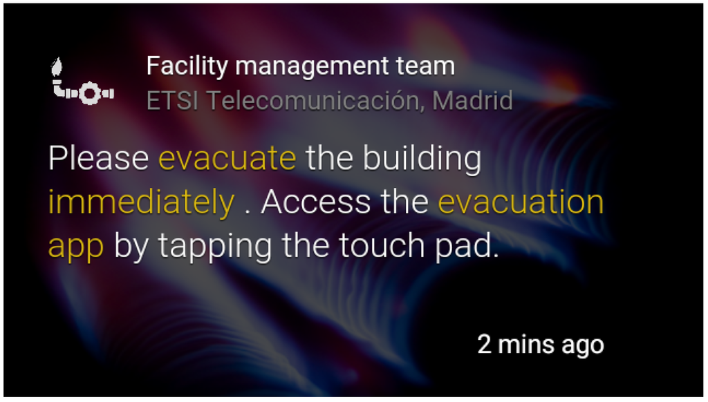 Emergency notification: The management web application provides an effective way to send users notifications about the simulated emergency. For this purpose, static cards [15] have been used. Five types of cards have been designed depending on the type of emergency: fire, earthquake, water leak, gas leak and warning. These cards are written in HTML, a language that Google Glass can read and represent on the screen, as exemplified in Figure 6 and Figure 7. They count with the following built-in actions: