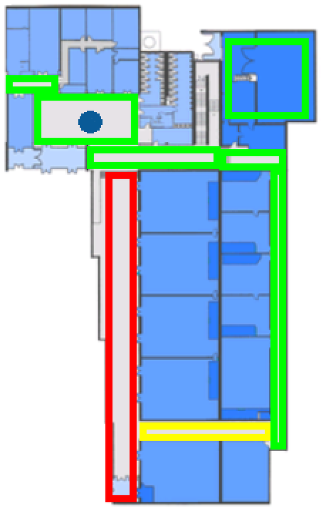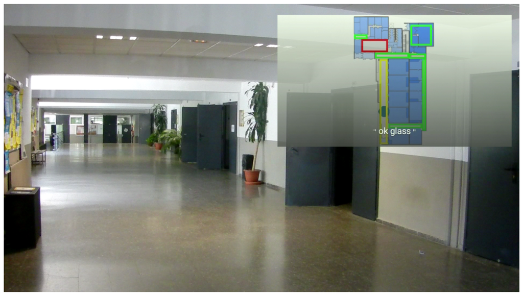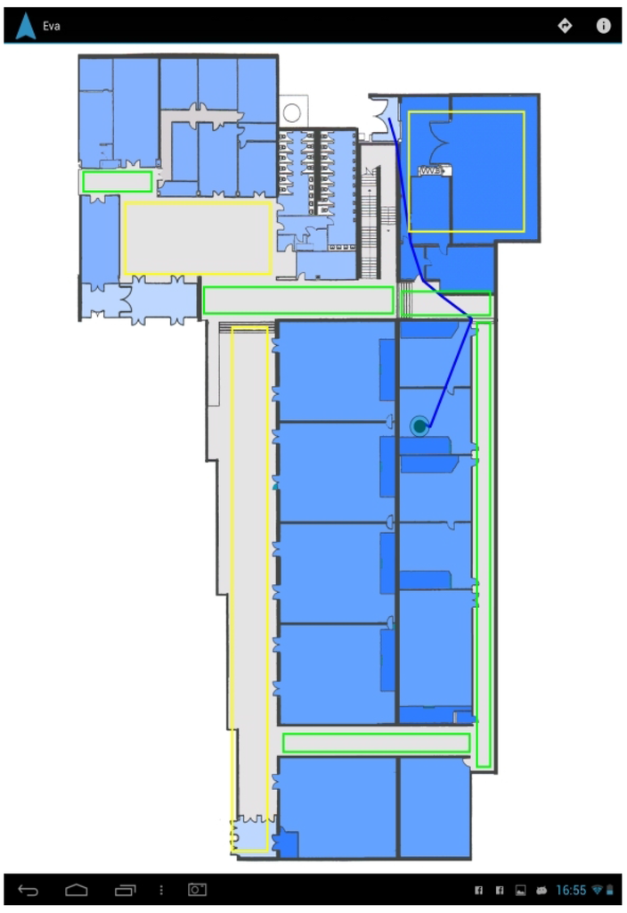 The developed Google Glass application provides a visualization of the building footprint to the user, where his or her location is pointed at with a circle, and the chosen evacuation route towards an exit is shown in blue. The map also provides a room congestion indicator based on colored rectangles (red means highly crowded; green means little congestion), as shown in Figure 9.