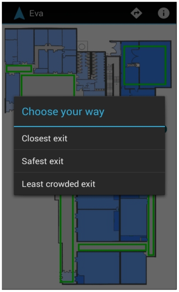 The application also allows experimenting with several strategies for a decentralized evacuation support [55] based on different risk avoidance strategies of the users. Users can select to go to the closest exit, to the safest exit (the greatest distance from the emergency) or to the least crowded exit, using the voice interface or the integrated menu system.