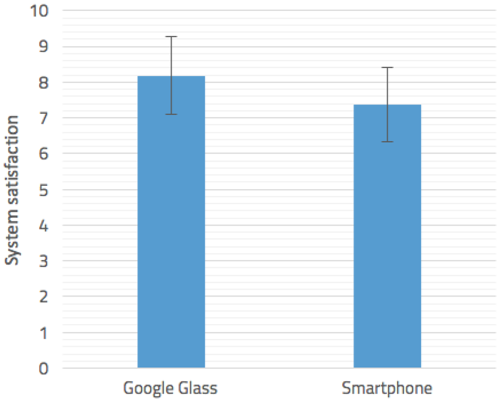 Regarding Hypothesis 1, results show that the average satisfaction per user with the two different interfaces was 8.18 (Google Glass) and 7.375 (Mobile device). The mean and standard deviation of the satisfaction with both devices are shown in Figure 14. The ANOVA analysis that we performed indicated that the difference was statistically significant (p = 0.0342 < 0.05). No group effects were observed regarding the counterbalancing. These results support our first hypothesis, concluding that users appreciate the Google Glass interface rather than the smartphone one, which show a better acceptance of hands-free devices for emergency situations.