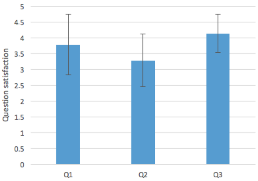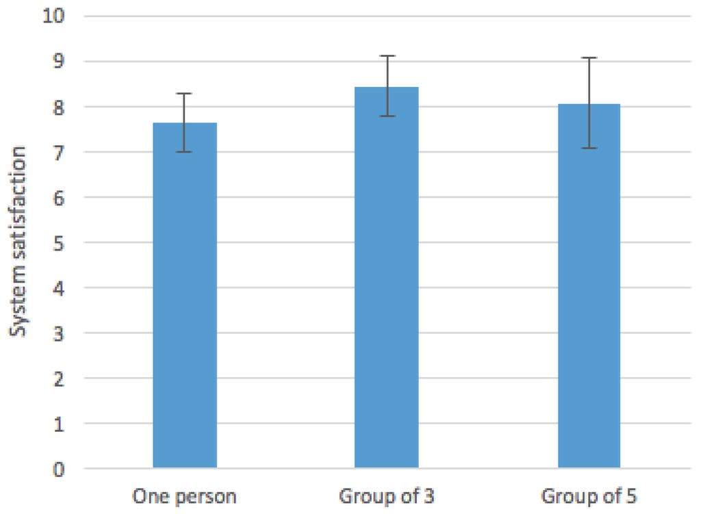Regarding Hypothesis 2, we can check that the average satisfaction per user was 7.62 (1 person), 8.43 (group of three people) and 8.06 (group of five). The mean and standard deviation of all of the groups are shown in Figure 15. The performed ANOVA analysis indicated that the difference was statistically significant (p = 0.0407 < 0.05). These results also support our second hypothesis, concluding that users have a better experience when being in the simulated evacuation with more people, because the satisfaction of both group options (i.e., three and five people) is above the individual option. Moreover, we can observe a decrease in the average score for the five people option, but the standard deviation increases. This divergence could be due to the usage of the free version of the indoor positioning service INDOO.RS, because it shows some slow response when several users are connected to the application at the same time. That would decrease considerably the satisfaction of the final user. However, as a conclusion, the collected data show an acceptance of participatory simulations to train people for emergency situations showing good satisfaction rates both in groups or individually.
