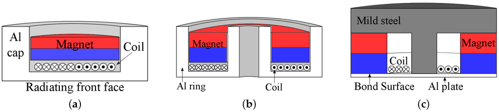 Schematic diagrams of the cross sections of the three transducer designs investigated in this paper. (a) Cap transducer A; (b) ring transducer B; and (c) enhanced field transducer C.