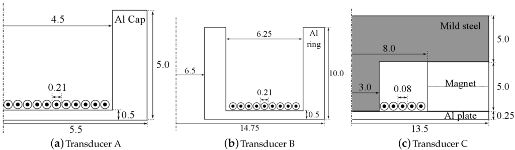 While the operational principles of the EDFT device proposed in this paper are similar to those of an EMAT, there are some subtle differences—mainly the dilation characteristics of the flexural membrane and how they affect the induced magnetic/electric fields. A complete understanding of this physical phenomenon warrants a detailed investigation, and will be reported at a later date. The main purpose of this paper is to perform an empirical study on three selected proof-of-concept EDFT device configurations.
