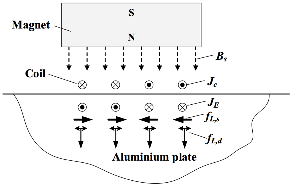 Working mechanism of an electromagnetic acoustic transducer (EMAT) on an aluminium sample. is the Lorentz force due to the dynamic magnetic field, and the Lorentz force from the static magnetic field.
