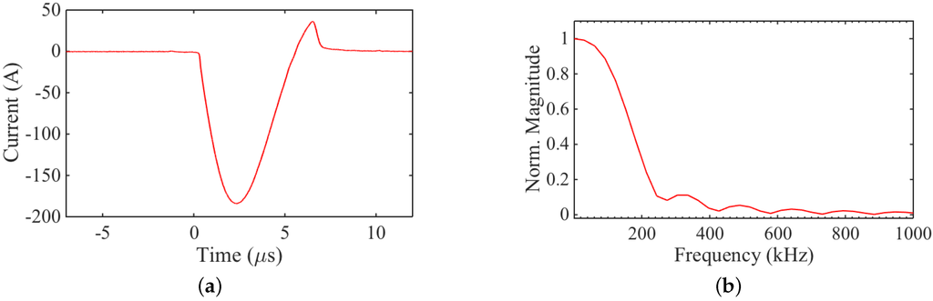 (a) Excitation current pulse over a small resistance (100 mΩ) in series with the transducer coil; and (b) frequency content of the excitation pulse.