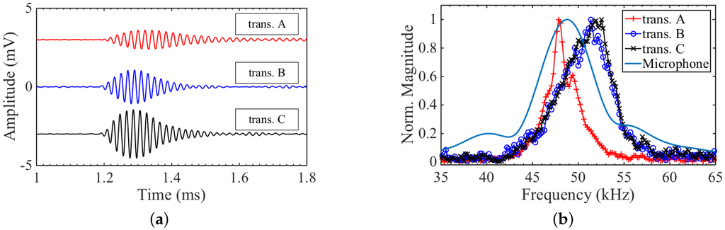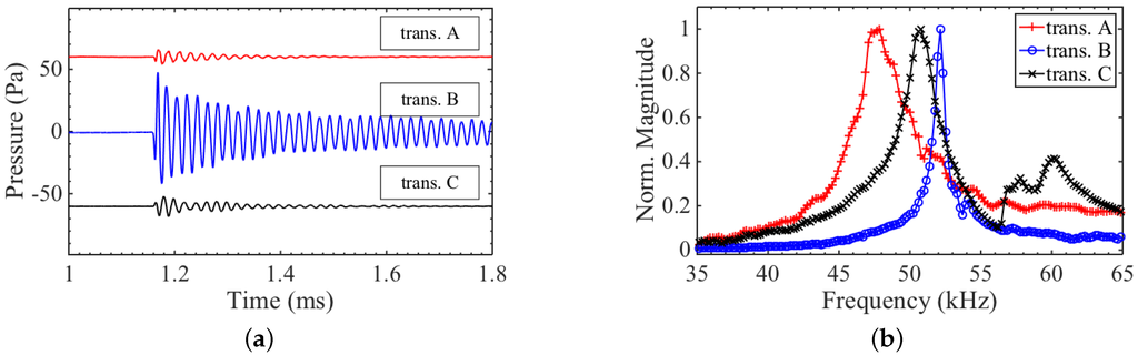 The frequency content of the generation signals from the transducers is shown in Figure 5b. The bandwidth of transducer B is lower compared to A and C, due to the longer ring down time, on the order of a millisecond. In general, all three transducers exhibit long ring down due to the resonant behaviour and lack of mechanical or electrical damping used. In the frequency spectrum of transducer C, there is a sharp rise around 56 kHz that looks similar to a feature commented upon in [15], which was due to the presence of non-axisymmetric vibration modes.