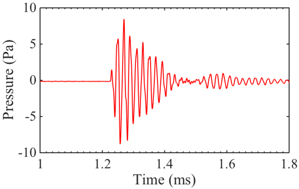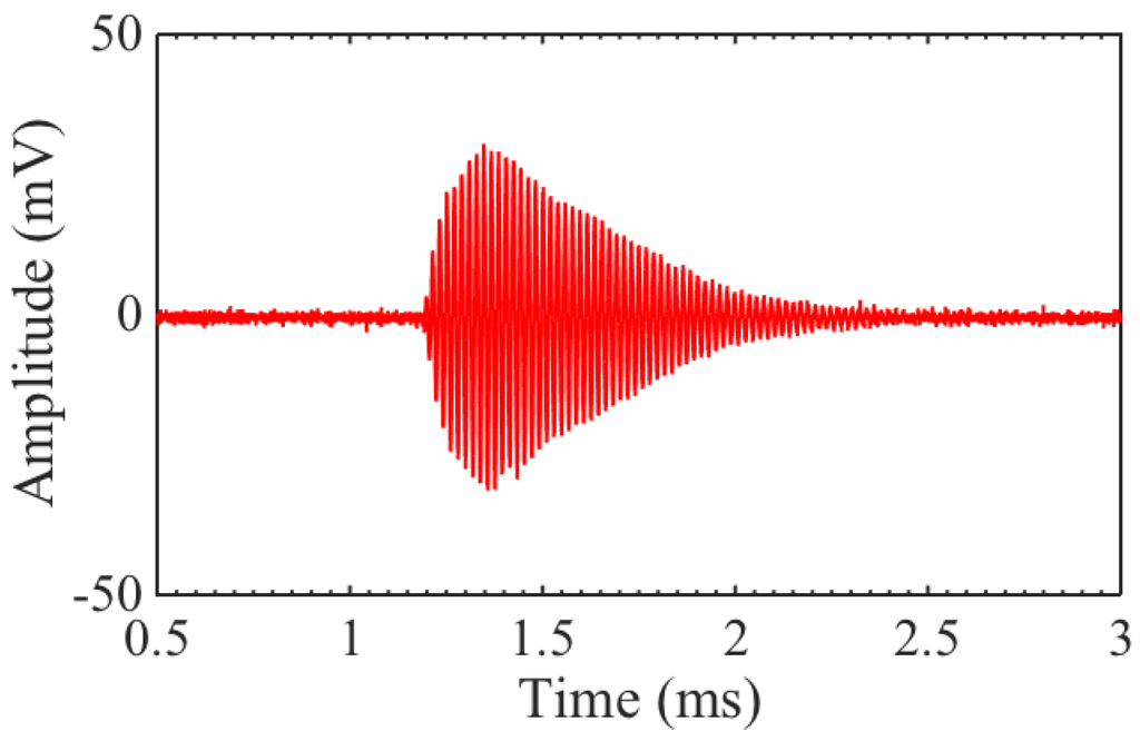 As a last test, transducers B and C were set up in transmit–receive mode, with B generating and C receiving, since they produced the largest output pressure and had the best sensitivity, respectively. The distance between the transducers was roughly the same as for previous measurements, at ∼40 cm. The resulting signal with 16 averages is shown in Figure 9. The signal was clearly visible with single shot SNR dB. The ring down time is relatively long, because both the transmitter and receiver are resonating at 50 kHz.
