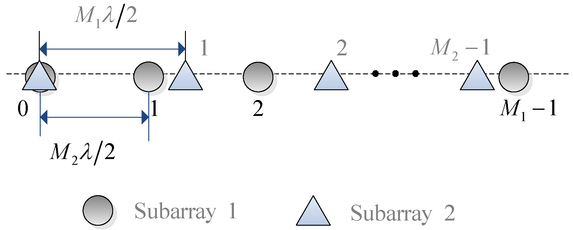 As shown in Figure 1, we consider a co-prime linear array consisting of two uniform linear subarrays, which are located in the same line. The first subarray has equal-spaced omnidirectional sensors with inter-element spacing , while the second has equal-spaced omnidirectional sensors with inter-element spacing . Here and are co-prime integers, and λ is the wavelength. The two subarrays share the first sensor, and consequently the co-prime array has sensors.