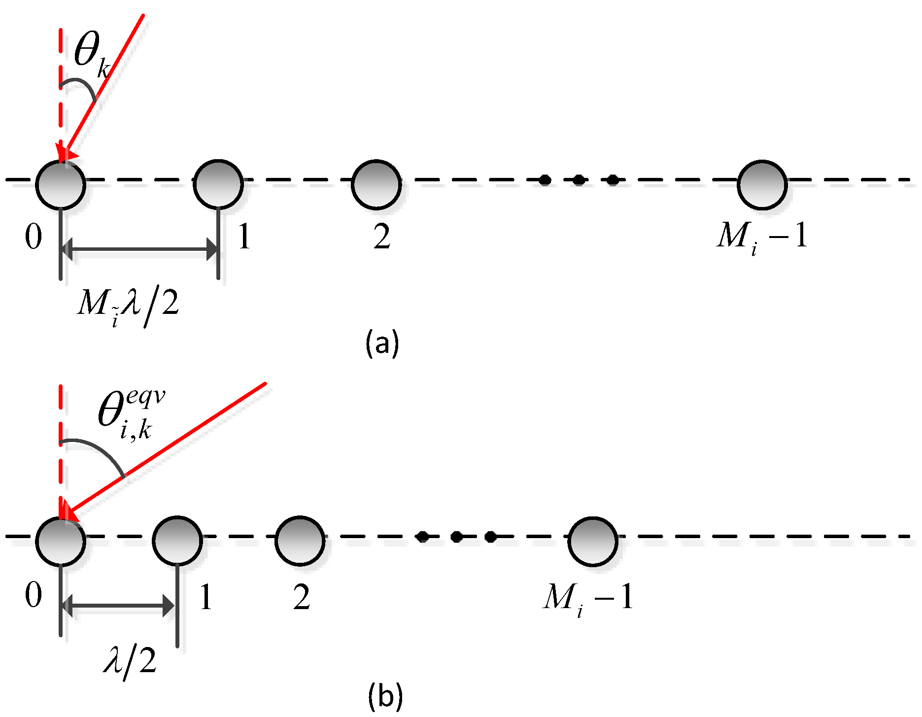 The System model of (a) the ith subarray and (b) its corresponding equivalent array of the co-prime linear array. is the true DOA for the kth source, and is the equivalent angle.