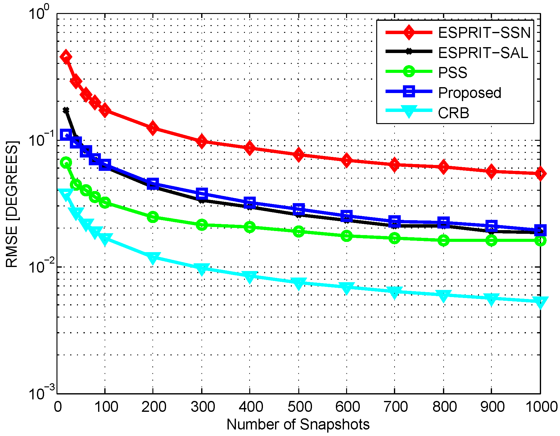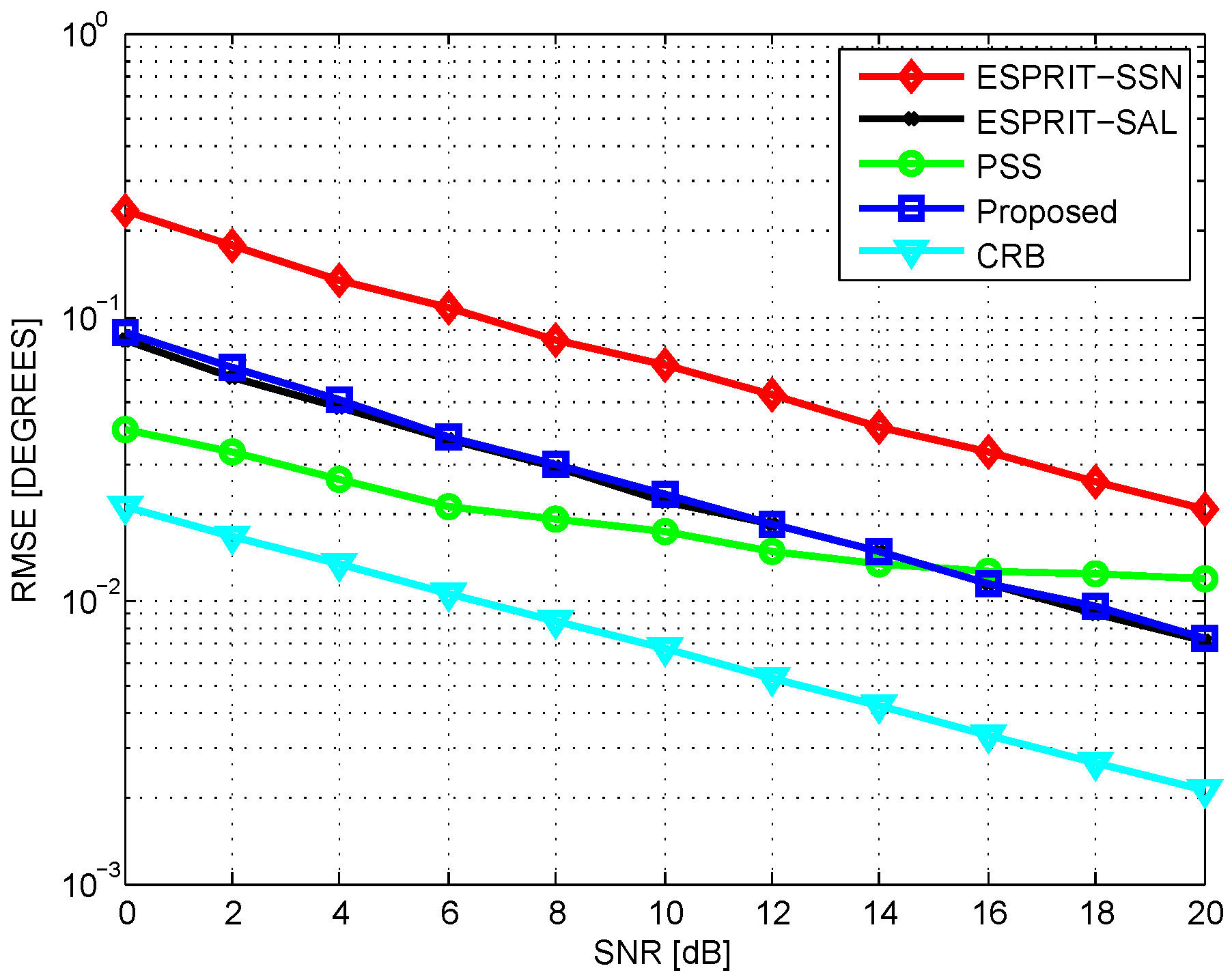 Root mean square error (RMSE) vs. signal-to-noise ratio (SNR), . CRB: Cramer–Rao bound; ESPRIT: estimation of signal parameters via rotational invariance technique; ESPRIT-SAL: ESPRIT with the same aperture length; ESPRIT-SSN: ESPRIT with the same sensor number.