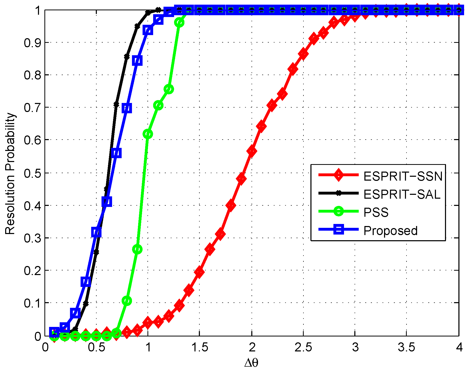 In the second test, we investigate the resolution probability performance. The two sources are said to be resolvable [22] if both and are smaller than , where and () are the true and estimated DOAs, respectively. We set and , where is the control variable. We fix dB and and plot the resolution probability against in Figure 5. As can be seen, the resolution ability is enhanced with the increase of . The proposed method provides almost the same resolution performance as ESPRIT-SAL, but with substantially reduced complexity. The proposed method provides the best resolution performance as compared to ESPRIT-SSN and PSS.