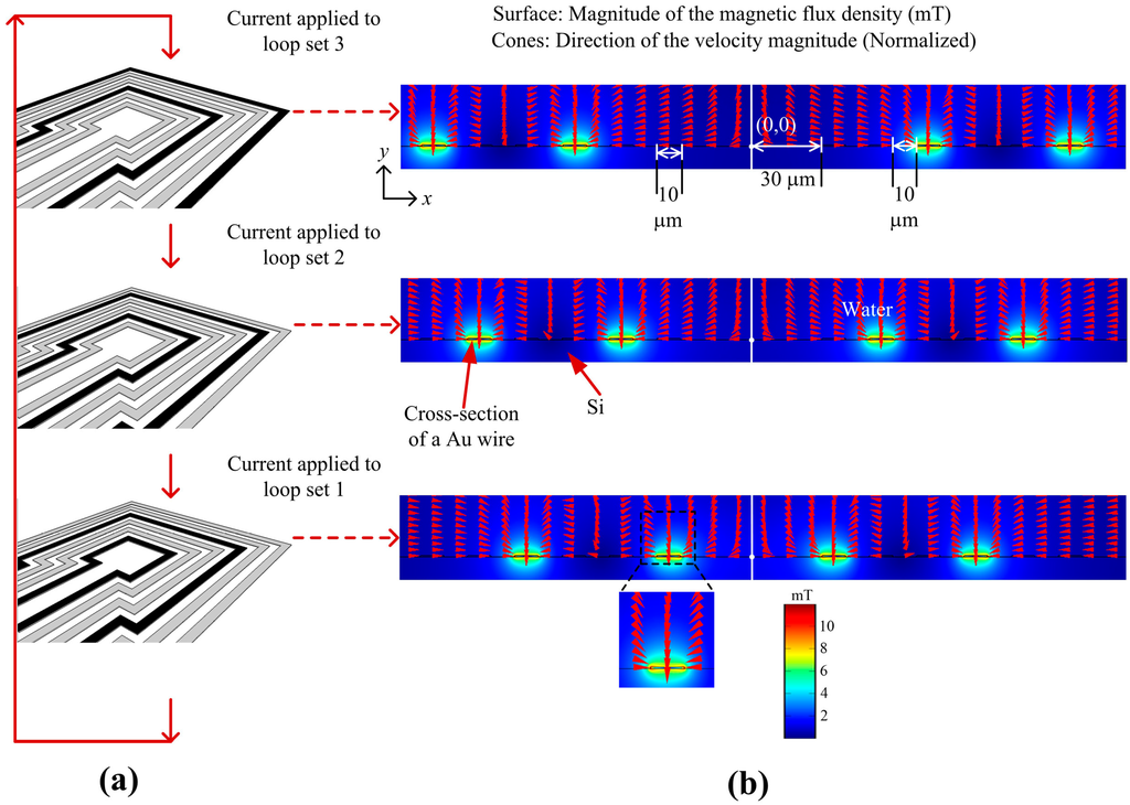 (a) Design of the magnetic actuator; (b) Magnitude of magnetic flux density (surface plot) when 125 mA of electric current was applied sequentially to the 3 loop sets.