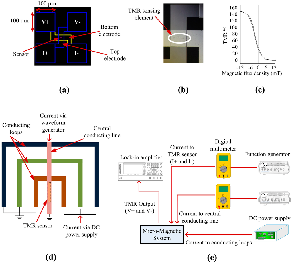 (a) Design of the TMR sensor; (b) Fabricated TMR sensing element; (c) Sensitivity of the TMR sensor; (d) MA and TMR sensor integration; (e) Experimental setup for magnetic bead detection.