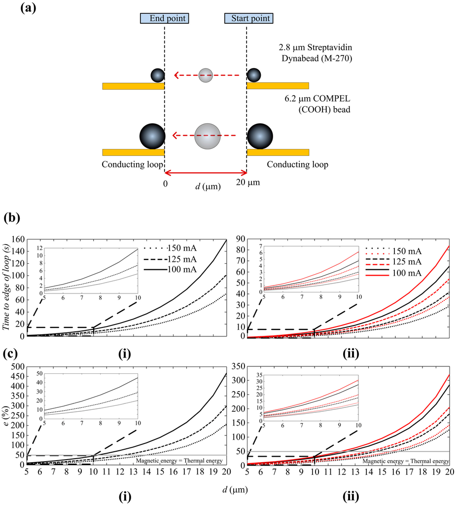 In comparison, a COMPEL™ bead has only 2.93 times more magnetic material than a Dynabead®. This results in the Dynabead® having a larger Catt than a COMPEL™ bead and therefore, being attracted to a magnetic source faster than a COMPEL™ bead. Moreover, the drag coefficient for a COMPEL™ bead is higher since the radius of a COMPEL™ bead is 2.2 times larger than a Dynabead®. Therefore, a Dynabead® travels faster towards a loop than a COMPEL™ bead. The errors at 1 μm intervals were also calculated according to Equation (4). Several considerations were taken into account in choosing the time of 10 s for error calculations. Figure 4b(i) shows that a COMPEL™ bead takes 70.62 s to travel to a loop when d = 20 μm and I = 150 mA. However, this timeframe is not practical, since it corresponds to an increase in temperature by 60 °C from an initial temperature of 21 °C at the edge of the loop (See Figure A4 and Table A1). An increase in temperature of 60 °C did not have an influence on the COMPEL™ beads, Dynabeads® and the polystyrene particles, which are all polymer based beads/particles and are stable up to a temperature of 100 °C, or the bond between the streptavidin, DNA and polystyrene particles, which generally require temperatures up to 90 °C and other additives to break the bond. However, it might damage other types of beads, cells attached to beads or the bond between beads and cells. The main issue we encountered in our experiments when the temperature increased was a reduction of the time it took for the droplet to evaporate. Experiments showed that the droplet formed on the surface of the MA when a sample solution was dispensed has a drying time of approximately 10 min at room temperature but decreased to 2 min when the temperature increased by 60 °C on the chip. This timeframe was not practical for observing and analyzing SPBs with the MA since, as the droplet started drying the SPBs and particles in the solution moved with the droplet, thus making control by magnetic forces impractical. The errors are shown for a COMPEL™ bead in Figure 4c(i) and a Dynabead® in Figure 4c(ii). An error of 207% at d = 20 μm, as shown in Figure 4c(i), suggests that d = 20 μm is not feasible for a COMPEL™ bead. An error of 62% at d = 15 μm indicates that diffusion still dominates the magnetic force and therefore, a COMPEL™ bead will be less likely to move towards the edge of the loop. Generally, e >> 50% will ensure an SPB travels due to the magnetic force rather than diffusion. The error when d = 10 μm and I = 150 mA is 20% and the time taken to travel is 5.19 s. The error and time taken to travel when I = 125 mA do not vary too much from the corresponding values for 150 mA; the error is only 10% higher and the time taken is only 2 s longer. Furthermore, the temperature rise is also lower when I = 125 mA (see Figure A4). Based on the above analysis, d = 10 μm and I = 125 mA were chosen in the design of the MA. A characteristic measurement time of 10 s was considered appropriate given the time taken for a COMPEL™ bead to travel 10 μm is 7.47 s. Figure 4c(ii) shows that the error for a Dynabead® taking into account these parameters is 18%, and increases to 20% when a 1 μm polymer bead is attached to it. Note that even though the errors and the time taken are lower when d = 5 μm, this value was considered to be too small since a COMPEL™ bead is 6 μm in diameter. Also, the times taken are too close to each other to observe the differences in travel velocities between a COMPEL™ and a Dynabead®.