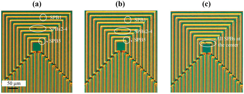 The capability of the MA to manipulate single SPBs with high precision is shown in Figure 5. Initially, as shown in Figure 5a, five COMPEL™ SPBs were trapped at different loops of the MA. There is one SPB on the innermost loop (SPB 5), three SPBs on the middle loop of loop set 2 (SPBs 2-4), and one SPB on the outermost loop of loop set 2 (SPB 1). In the next phase of the experiment, as shown in Figure 5b, the current is switched and the SPBs move one loop closer to the middle of the MA. Therefore, it can be deduced that the current had to be switched a further 6 times in order for the SPB in the outermost loop, SPB 1, to be manipulated to the innermost loop, and this can be seen in Figure 5c. The other three SPBs (SPBs 2–4) reached the innermost loop after the current was switched four times. All five SPBs remained trapped at the innermost loop until the current was switched off. Also, if the SPBs needed to be moved in the opposite direction, from the innermost loop towards the outermost loop, current could be switched between the loop sets in a reverse configuration. Similar experiments were also performed with bare Dynabeads® and a polystyrene particle (polystyrene YG particle) attached to Dynabeads®.