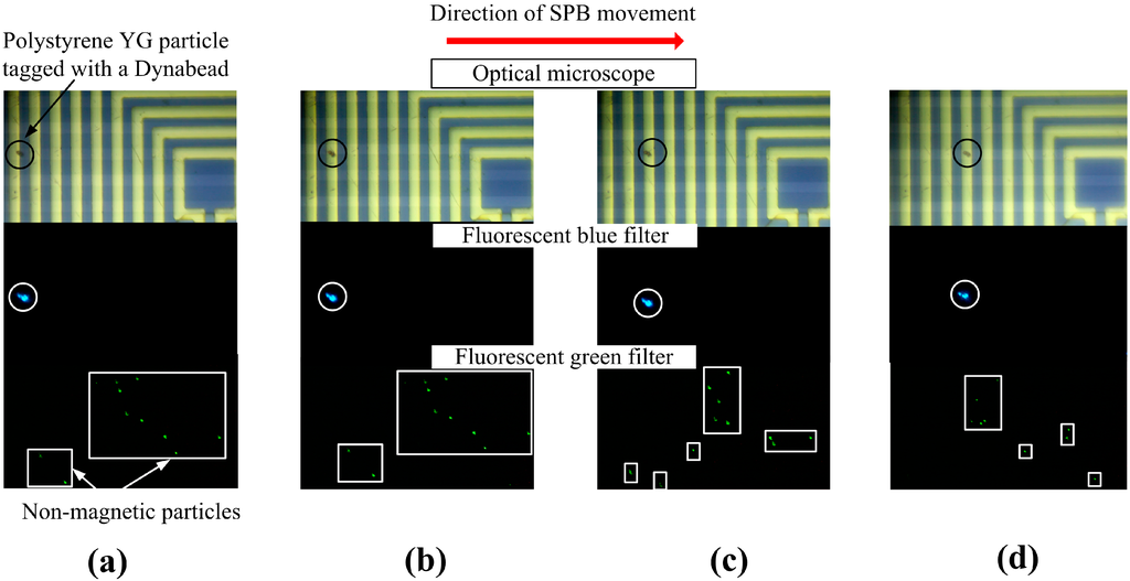 Figure 6 shows the movement of a Dynabead® with a polystyrene YG particle attached to it in a heterogeneous solution. One µL of sample solution containing both compound particles made of polystyrene YG particles attached to SPBs (fluorescent blue) and polystyrene PC particles (fluorescent green signal) was dispensed to the surface of the MA. The purpose of the polystyrene PC particles is merely to simulate a heterogeneous environment. Initially, when no current was applied to the MA, the SPBs and PC particles moved about randomly. When current was applied to loop set 1 a YG/Dynabead® particle was attracted to the outermost ring and, thereby, separated from the non-magnetic particles. The area on the MA, where the YG particle is located, is magnified, to clearly show the separation procedure. Three images were taken for each of the manipulation steps shown, since the fluorescence microscope did not have the capability to observe all three colors simultaneously. Therefore, the fluorescence filter was set to match the spectral emission of the respective particles: the SPBs are black, the YG particles attached to the SPB are blue, and the unattached PC particles are green. The images on the top show only the SPB, the center shows only the YG particle attached to the SPB, and the bottom shows the PC particles. The PC particle was initially located at the outermost loop of set 3 (Figure 6a). When current was switched to loop set 2 this particle moved to the next loop, which is the outermost loop of loop set 2 (Figure 6b. The YG particles were not influenced by the action of the MA and, therefore, traveled in a random trajectory due to Brownian motion. When the current was switched to loop set 1, the YG particle followed the shift in the maximum flux density and was trapped at the outermost loop of loop set 1 (Figure 6c). Upon repetition of this process, the YG particle moved to the next ring, which is part of loop set 3 (Figure 6d). Finally, the YG particle reached the desired destination (center of the MA).