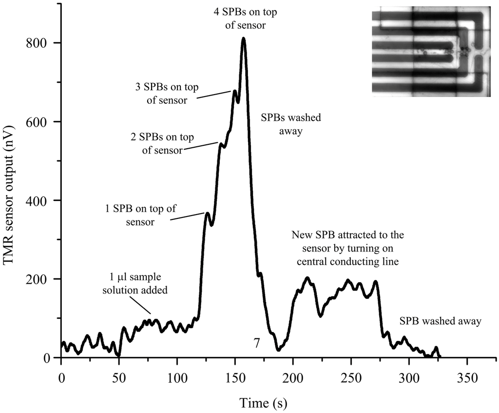 Finally, we demonstrate how the simple, yet effective, design of the MA can be integrated with a tunnel magnetoresistive (TMR) sensor to form an integrated micro-chip for the detection of SPBs. Figure 7 shows the output signal of the TMR sensor after dispensing 1 µL of the sample solution. Initially we used the MA to attract SPBs to the innermost loop in the MA, Then, after 25 s, the central conducting line was turned on, and the MA was turned off, to attract the SPBs from the innermost loop of the MA to the central conducting line and, hence, to the top of the TMR sensor. As the first SPB reached the top of the sensor after 125 s, a signal of about 250 nV was generated. Every additional SPB that reached the sensor surface increased the signal, as can be seen at 140 s, 150 and 165 s. After washing away the SPBs, the signal dropped to zero, at 175 s. By turning on the current at the central conducting line, a new bead was attracted (250 s) before washing it off again (300 s). Individual SPBs were detected with a signal to noise ratio of about 3, which, in combination with the MA, provides a powerful tool for bioanalytical experiments.