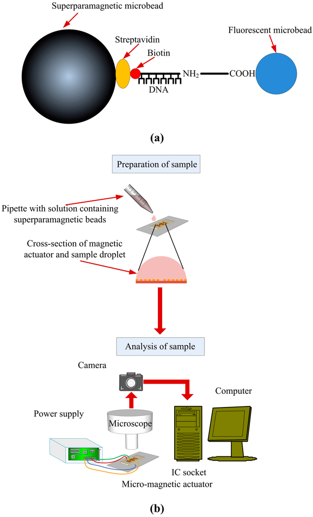 (a) Attachment of DNA to a superparamagnetic bead; (b) Experimental setup for manipulation of magnetic beads by the magnetic actuator.