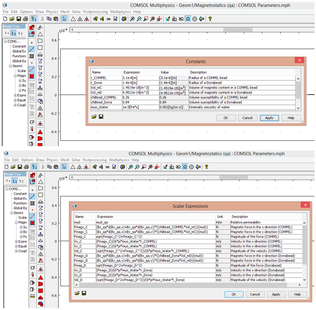 COMSOL constants and expressions for calculating magnetic force and velocity.