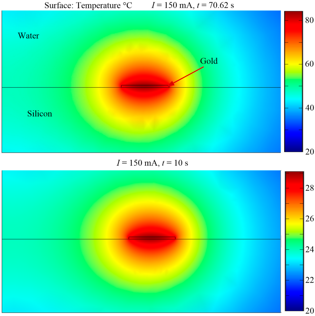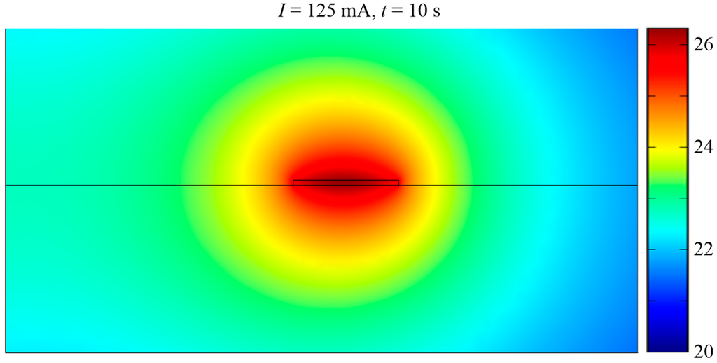 Superparamagnetic beads (SPBs) have attracted a lot of interest for sorting, separating, purifying and detecting biomolecules in assays [,,,,,,,,,,,]. A large number of magnetic micro-devices have been developed in recent times for on-chip manipulation of SPBs [,,,]. In these devices, the magnetic force used to manipulate SPBs is provided by micrometer sized electromagnets, soft-ferromagnetic structures, or some combination of both. However, some of these do not allow precise and controlled SPB manipulation, resulting in low trapping efficiencies, while some are not designed for integration with magnetic sensors for detection of SPBs. More recently, domain wall motion in nanometer thick permalloy patterns has been used to precisely transport SPBs to a target location [,] as well for detection of SPBs [,,,,]. However, these devices employ bulky off-chip electromagnets or permanent magnets as magnetic field generators, which must be aligned to features on the micro-device. Moreover, the fabrication is more complex and time consuming compared to simple micro-electromagnets or permanent magnets. However, one of the main disadvantages of on-chip electromagnets compared with permanent magnets and external magnetic field generators is that they can increase the temperature of the chip when there is current flowing through them. An increase in the temperature of the solution might alter the SPBs’ behavior and/or the biomolecules attached to it. However, how much of an influence this has on the results depends on the material the electromagnet is made of and its dimensions, as well as the thermal time constants of the experimental solution. Also, the duration of current flow through an electromagnet is an important parameter to consider in the design of on-chip electromagnets.