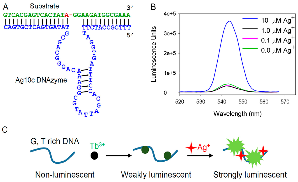 (A) The secondary structure of the Ag10c DNAzyme. For the Tb3+ luminescence experiment, the substrate is the all-DNA analog and cannot be cleaved; (B) Tb3+ luminescence spectroscopy with the Ag10c DNAzyme in the presence of 0, 0.1, 1 and 10 µM concentrations of Ag+; (C) A scheme showing the effect of Ag+ in promoting the luminescence of poly G, T DNA.