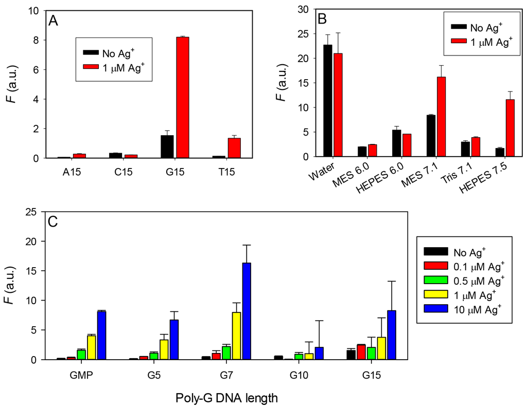 To have a full understanding, we next tested different 15-mer DNA sequences (Figure 2A). Overall, A15 and C15 gave very weak luminescence regardless of Ag+ concentration. Both G15 and T15 showed Ag+-enhanced emission. The overall intensity was much higher with the G15. Therefore, we focused on poly-G DNA for the subsequent studies. Based on these results, we also conclude that the observed emission enhancement in the Ag10c DNAzyme (Figure 1B) is likely due to its nucleotides instead of the specific Ag+ binding.