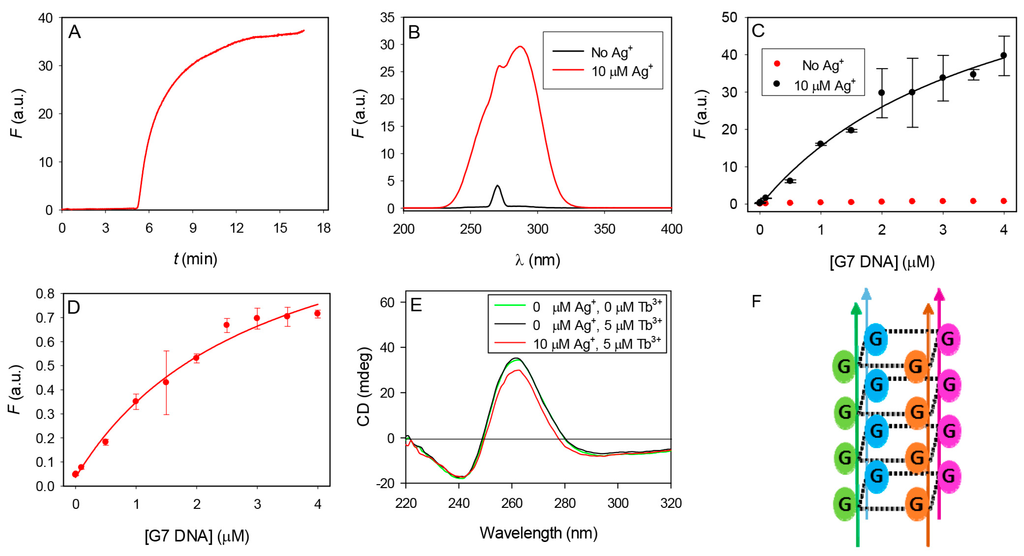 Mechanistic studies. (A) Kinetics of emission change upon addition of 10 µM Ag+ at 5 min; (B) Fluorescence excitation spectra of Tb3+ (5 µM) and G7 (1 µM) in the absence and presence of 10 µM Ag+ in 50 mM HEPES pH 7.5 buffer by monitoring emission at 543 nm; (C) Titration of G7 to Tb3+ in the absence and presence of Ag+; (D) The red trace in (C) at a smaller y-axis scale to determine the Kd values based on F = F0 + aC/(Kd + C), where F and F0 are the current and initial fluorescence intensity, respectively, C is added DNA concentration, and a is the final fluorescence enhancement at infinitely high DNA concentration; (E) The CD spectra of 1 µM G7 DNA in 50 mM HEPES pH 7.5 and upon the sequential addition of 5 µM Tb3+ and then 10 µM Ag+; (F) A general schematic of the four-stranded parallel G-quadruplex structure.