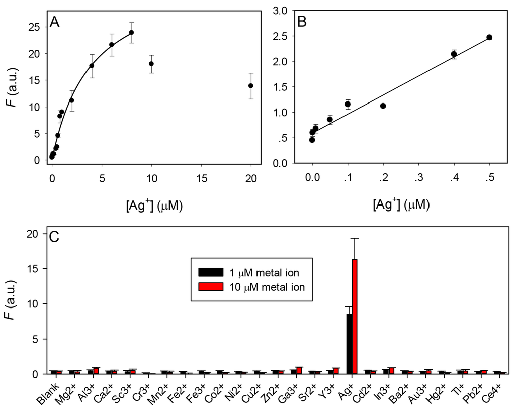The performance of the G7 DNA (1 µM) and Tb3+ (5 µM) based sensor for Ag+ detection in 50 mM HEPES pH 7.5 buffer. (A) Sensor response to various Ag+ concentrations; (B) The sensor response at low Ag+ concentrations; (C) Sensor selectivity test at two metal concentrations. Only Ag+ produced the signal. Each experiment in this paper was repeated at least twice and the error bars represent the standard deviation of these measurements.