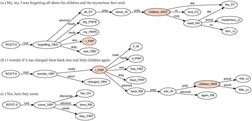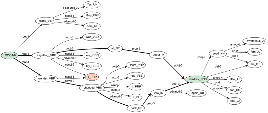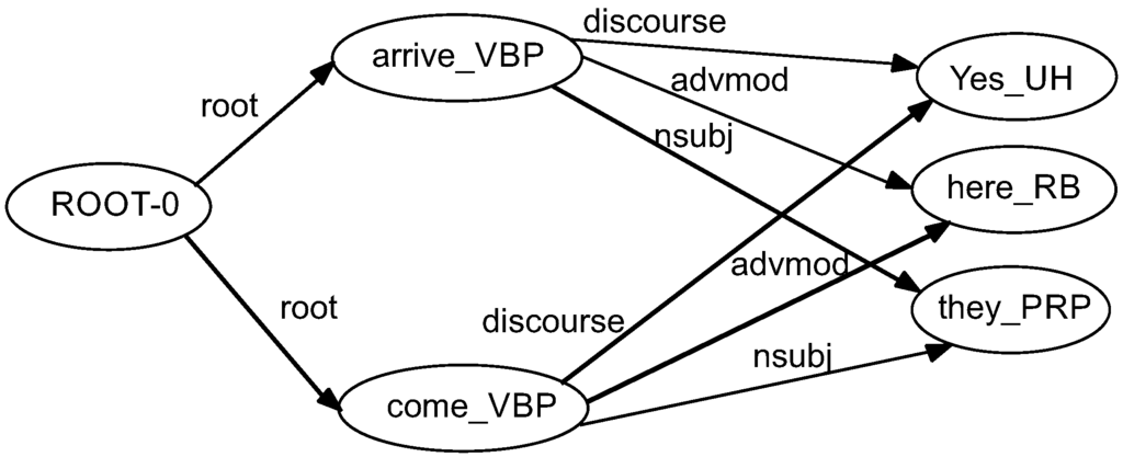 MorSyn feature set includes the extraction of POS tags of the nodes of the graph, as well as dependency tags, which represent the relations between each pair of nodes (vertices). Note that in this feature set, we do not use lemmas in graph nodes and do not consider frequencies for the vertices. The