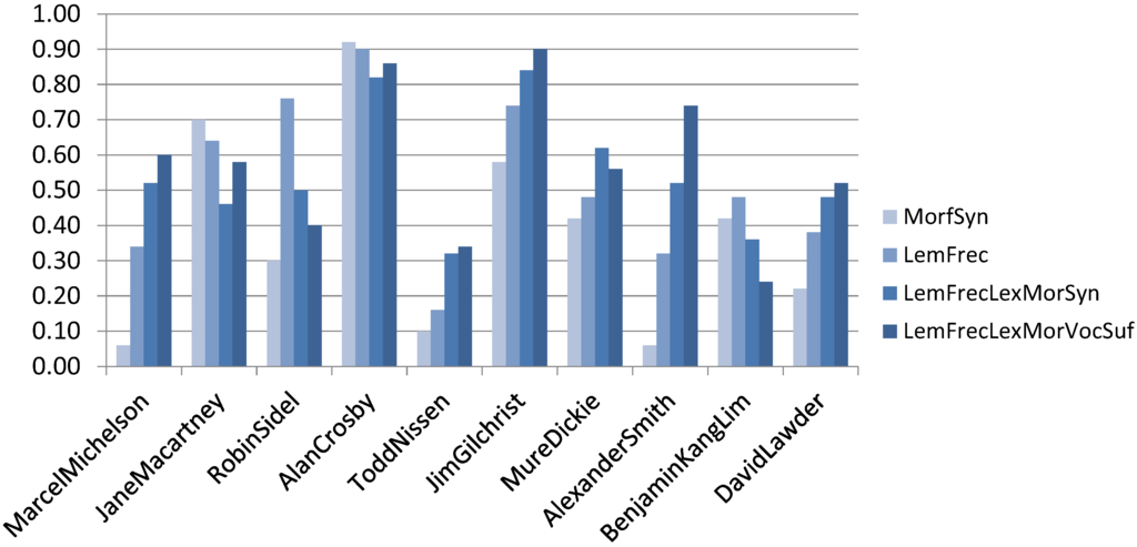 Figure 4 depicts the results obtained for each one of the ten authors of the C10 Corpus using the different feature sets.