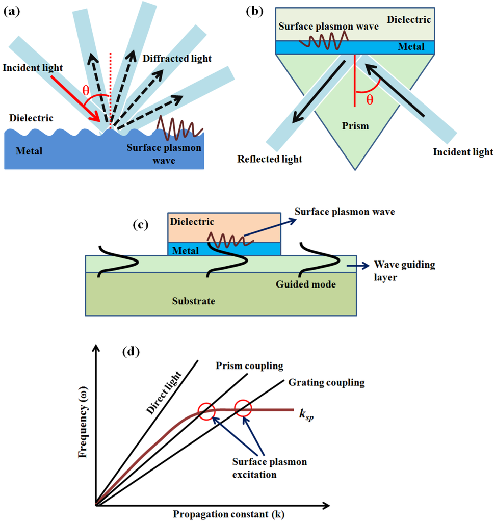 The schematic of (a) grating-; (b) prism-; (c) waveguide-based coupling configurations for SPR generation and (d) the surface plasmon excitation possibilities by using evanescent wave in the dispersion curves.