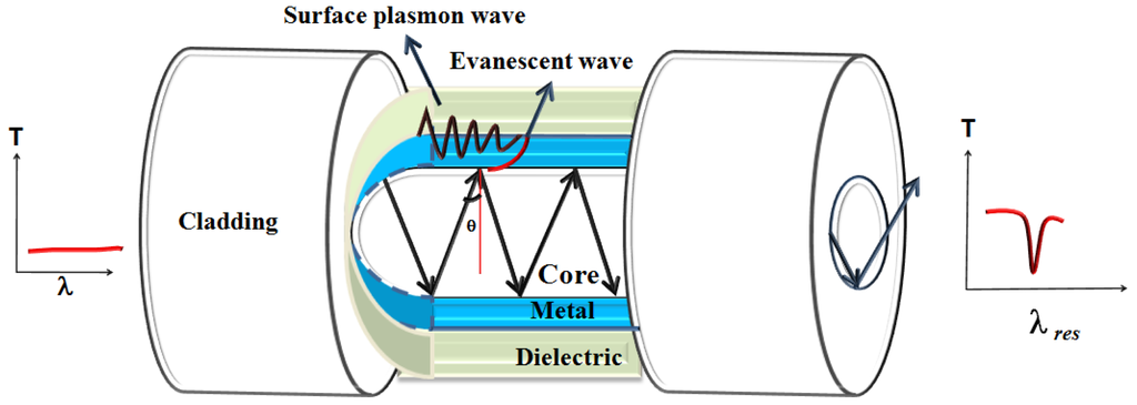 The use of optical fiber for implementing SPR started in 1990 [38,39]. After that the fiber optic SPR (FO-SPR) sensors have been reported for gas, chemistry and biology-related samples [40,41,42,43]. For the fabrication of a FO-SPR sensor, the cladding of the fiber is removed from the fiber structure leaving the bare core exposed for the length of sensing region selected. The metal layer is coated directly on the bare core of the fiber on top of which dielectric and other coatings are used if needed. The length of the sensing region needed is decided in accordance with the metal and dielectric layer chosen for a particular application. The sensing length influences the number of reflections of the ray in the core which further affects the width of the SPR curve [31]. The spectral interrogation scheme is used in fiber, instead of angular interrogation, since a range of guided rays are launched into the fiber [32]. The guided rays generate evanescent waves by total internal reflection which excites surface plasmons at the metal-dielectric interface. The excitation of surface plasmons through the evanescent wave is generally affected by three important factors: the fiber geometry (such as core diameter, probe geometry, V number, sensing length), the incident light properties (like angle of incidence and wavelength) and the metal thin film parameters (choice of metal, film thickness, film roughness) [31,32]. The sensing application involves the calibration curve of analytes by plotting the transmitted power from the fiber as a function of wavelength. The wavelength at which the dip occurs in the SPR curve gives the resonance wavelength, which changes with the change in the refractive index of the sensing medium.
