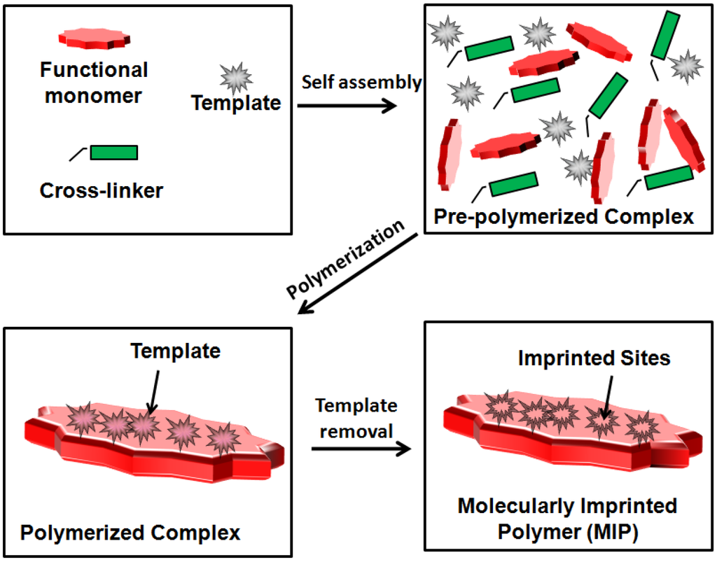 The MIP synthesis procedure demands the polymerization of functional monomer and the cross-linker around a template [68]. In the first step, template-monomer complexes are prepared with the reaction between a specific template and corresponding required monomer. This step is followed by the cross-linking polymerization reaction around the template-monomer complex. After polymerization, the template is unbound/removed from the achieved complex polymer with the help of the required remover. It may be noted that after the extraction of template molecules from the polymer, the template leaves its complementary imprint in the polymer. These imprints are usually known as the imprinted sites of the template and they contains a three-dimensional network with complementary shape and size to the template, which make the MIPs highly selective for the template molecule.