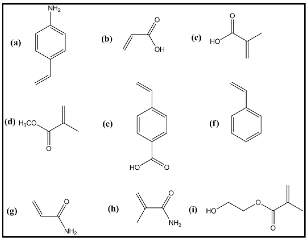 Chemical structures of common functional monomers used for MIP synthesis: (a) 4-vinyl aniline; (b) acrylic acid (AA); (c) methacrylic acid (MAA); (d) methyl methacrylate (MMA); (e) p-vinylbenzoic acid; (f) styrene; (g) acrylamide (AM); (h) methacrylamide; (i) 2-hydroxymethacrylate (HEMA).
