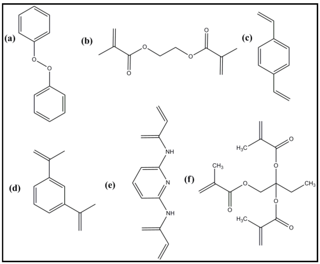 Chemical structures of common cross-linkers for MIP: (a) dicumyl peroxide (DCP); (b) ethylene glycol dimethacrylate (EGDMA); (c) divinylbenzene (DVB); (d) 1,3-diisopropenyl benzene; (e) 2,6-biscryloylamidopyridine; (f) trimethylpropane trimethacrylate (TRIM).