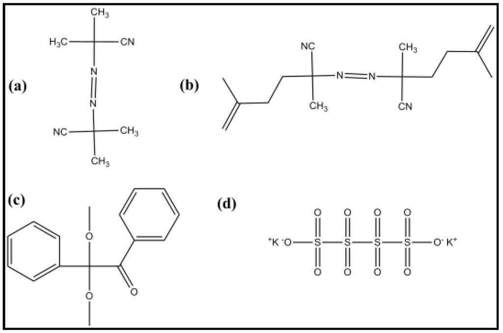 Common initiator structures used in MIP synthesis: (a) azobisisobutyronitrile (AIBN); (b) 4-4′-azo(4-cyanovaleric acid) (ACID); (c) benzoylperoxide (BPO); (d) potassium persulfate (KPS).