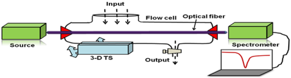During the last three decades, a tremendous amount of work has been carried out on fiber optic sensors (FOS) for applications in energy, the environment, biomedicine, agriculture, the food industry, buildings and many others due to their unique abilities of supporting biocompatibility, remote sensing and online monitoring with the possibility of miniaturized probes for point of care possibilities [1,2]. The main advantages of using optical fiber for sensing are ease of handling, low weight, low cost, immunity to electromagnetic interference, low power operation, withstanding harsh environment, etc. The optical fiber, in many cases, has replaced traditional substrates such as prisms, electrodes, etc. for the measurement of electrical and mechanical parameters such as strain, stress, magnetic field, current, acceleration, vibration [3], chemical parameters such as pH, glucose, and pesticides, gases, biological samples, refractive index and temperature [4]. In fiber optic sensors, the role of fiber can be either intrinsic or extrinsic, depending on whether the optical fiber is involved in the sensing purpose or not. In the case of extrinsic sensors, the fiber is simply used to guide/carry light from a source to the sensor module whereas in the case of intrinsic sensors, the light guiding properties of the optical fiber are modulated by the sensing medium. The modulation can be in terms of intensity, phase, wavelength, polarization, etc. [5]. For sensing various kinds of spectroscopic techniques/methods such as absorptiometry, refractometry, reflectometry, total internal reflection, interferometry, evanescent field, Doppler effect, Faraday effect, luminescence and surface plasmon resonance (SPR) have all been used.