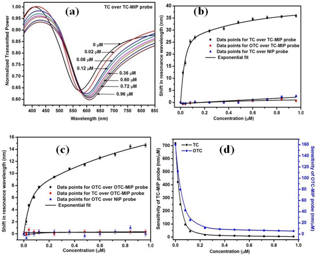The sensing probe was characterized for the OTC concentration range 0–0.96 µM. In this case the shift in resonance wavelength was found to be 14.668 nm with OTC concentration change as shown in Figure 9c. The sensitivity variation of both the probes (MIP-TC and MIP-OTC) is shown in Figure 9d. The response of both the probes for other analyte is negligible as shown in Figure 9b,c.